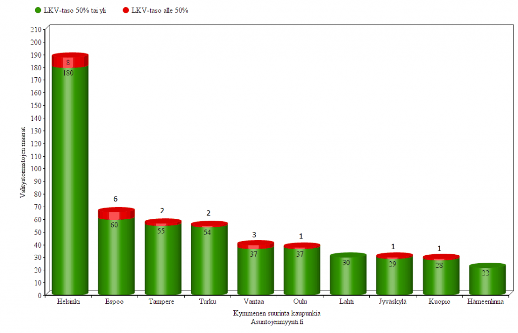 Suurista kaupungeista Joensuussa oli kesäkuun lopussa suhteessa eniten laillistettuja kiinteistönvälittäjiä. Kaupungin välittäjien kokonaismäärästä 82%:lla on tutkinto suoritettuna. Heikoin pätevyystaso on Vantaalla, jossa vastaava luku on 61%. Espoossa sen sijaan toimii suhteessa eniten sellaisia välitysliikkeitä, joilla lain vaatima pätevyystaso ei tällä hetkellä ole riittävällä tasolla.