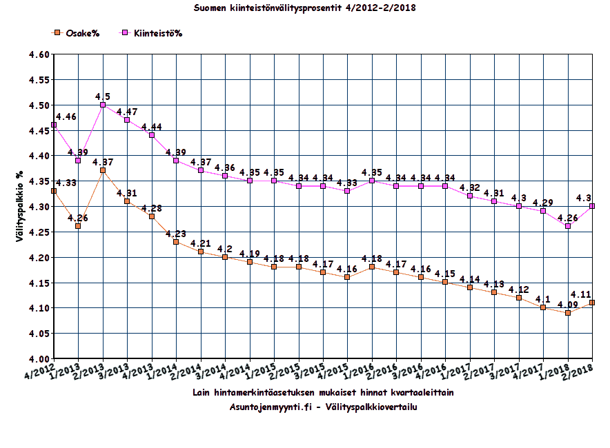 Ammattimaisen kiinteistönvälityksen hintojen kehitys 1/4 2018-2/4 2018.