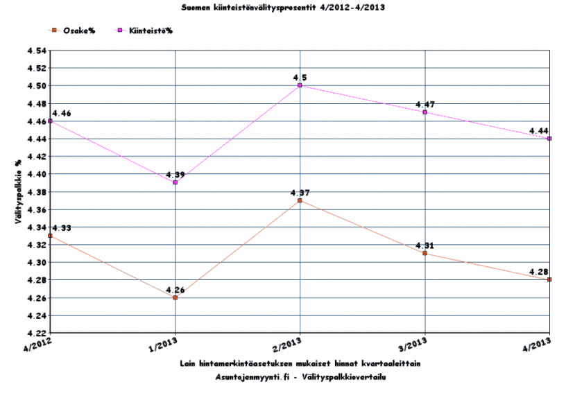 Ammattimaisen kiinteistönvälityksen hintojen kehitys 3/4 2013-4/4 2013.
