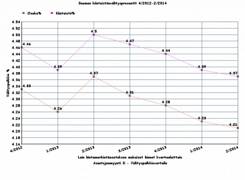 Ammattimaisen kiinteistönvälityksen hintojen kehitys 1/4 2014-2/4 2014.